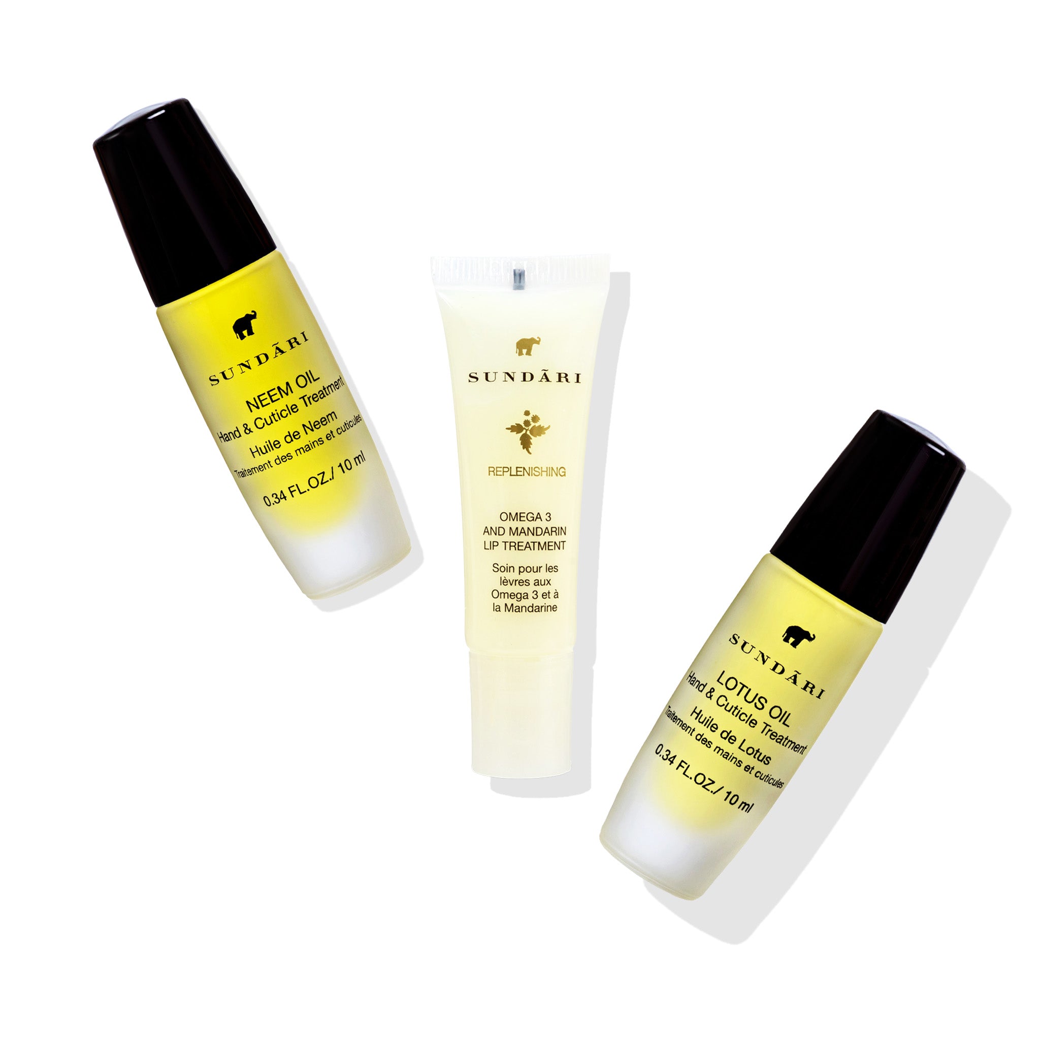 oryza sativa bran oil, helianthus annuus seed oil, citrus aurantium dulcis peel oil, bisabolol, citrus reticulata peel oil, vitis vinifera (grape) seed oil, phyllanthus emblica extract, terminalia chebula extract, terminalia bellerica extract, melia azadirachta seed oil, cananga odorata (ylang ylang) oil, aniba rosaeodora oil, citrus aurantium flower oil, rosa damascena flower oil, rosmarinus officinalis (rosemary) leaf extract